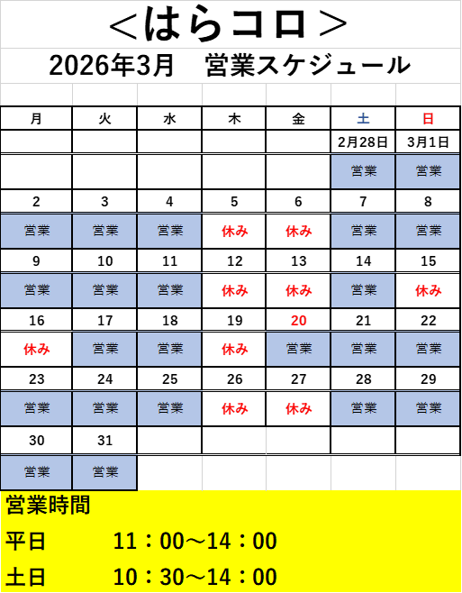 <はらコロ>営業カレンダー