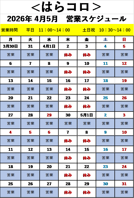 <はらコロ>営業カレンダー